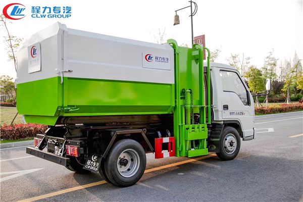 箱體采用邊三底四優質鋼板制作,箱體前部側面帶有掛桶提升機構,可搭配120升或240升塑料垃圾桶,自動舉升垃圾桶倒入垃圾,提 升機頂部機械翻蓋,箱體底部雙液壓缸舉升自卸,箱體后方設有擋水槽,尾部裝有橡膠密封條,防污水滴漏。